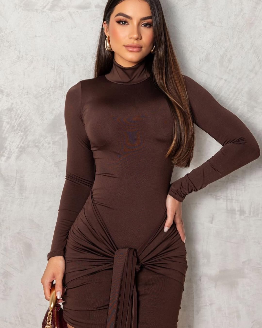 A amarração na cintura realça a silhueta, enquanto a gola alta e as mangas longas conferem um ar refinado e moderno.